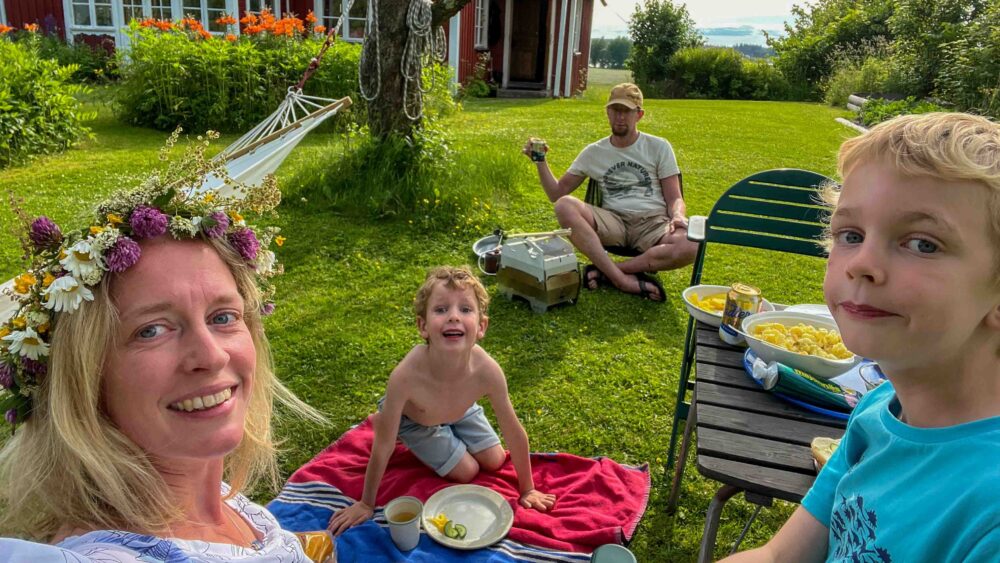 We had arranged to meet up with friends in Karlstad’s extensive park to help decorate the Maypole and to watch it being erected. Afterwards everyone sang, danced and picnicked. We rounded off the day with a barbecue under an apple tree in our garden.